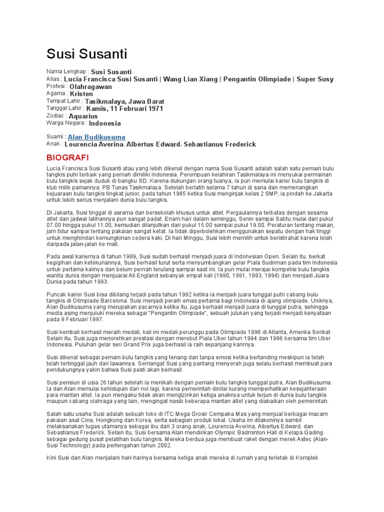 Ong lien hiang, born 11 february 1971) is a retired indonesian badminton player. Lucia francisca susi susanti ttl : Perjuangan susi susanti dan atlet lain juga dilakukan untuk membawa persatuan di indonesia yang sangat itu kondisinya sedang rentan. Saya enggak tahu akhirnya susi lubis ke mana, lanjutnya. Wiranata (nathaniel sulistyo) yang menjadi teman seperjalanan dalam mengharumkan nama bangsa.