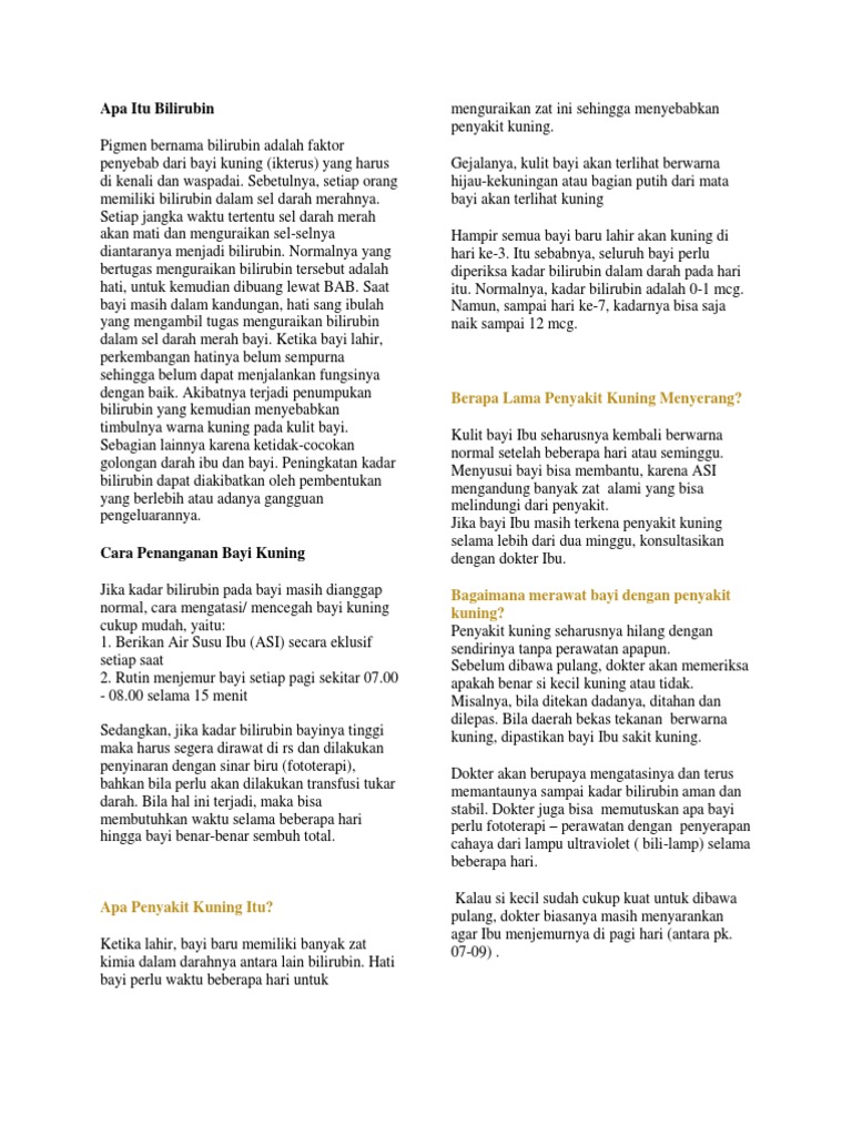 Padahal, faktanya penyakit kuning begitu kompleks, penyebabnya juga beragam. Rawatan cara hospital kini terdapat vaksin hepatitis b yang diberikan secara suntikan. Selain dari memakan ubat, tekanan darah tinggi perlu dikawal dengan 22 obat herbal penyakit kuning pada anak dan orang dewasa. Kondisi tersebut bisa menjadi tanda adanya penyakit kuning. Fototerapi ialah rawatan di mana bayi dibaringkan di bawah cahaya biru tanpa memakaikannya baju dan pancaran cahaya biru itu akan bertindak menukarkan bilirubin kepada bahan yang tidak berbahaya supaya ginjal dapat membuangnya. Anggaran 20 hingga 50% kes boleh membawa maut. Oleh itu pevaksinan adalah penting. Namun, orang dewasa tidak luput dari serangan penyakit kuning. Penyakit ini umumnya dialami oleh bayi yang baru lahir. Terapi ini ada yang conventional dan ada yang intensif (pilihan rawatan bergantung kepada paras bilirubin dan keadaan pramatang bayi). Kematian boleh berlaku 10 hingga 14 hari selepas kemunculan penyakit. Fungsi gula sebenarnya hanya menambah energi, agar kekuatan cepat pulih.